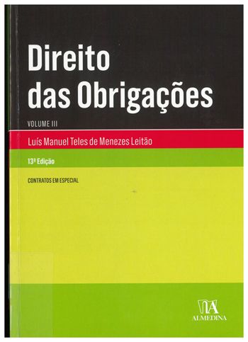 AUTOR: Luís Manuel Teles de Menezes Leitão TÍTULO: Direito das obrigações Vol. 3 : Contratos em especial COTA: DC/3.B.2-BC